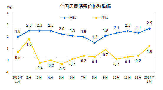 2017年1月份,全國居民消費價格總水平同比上漲2.5%。其中,城市上漲2.6%,農村上漲2.2%;食品價格上漲2.7%,非食品價格上漲2.5%;消費品價格上漲2.2%,服務價格上漲3.2%。 1月份,全國居民...