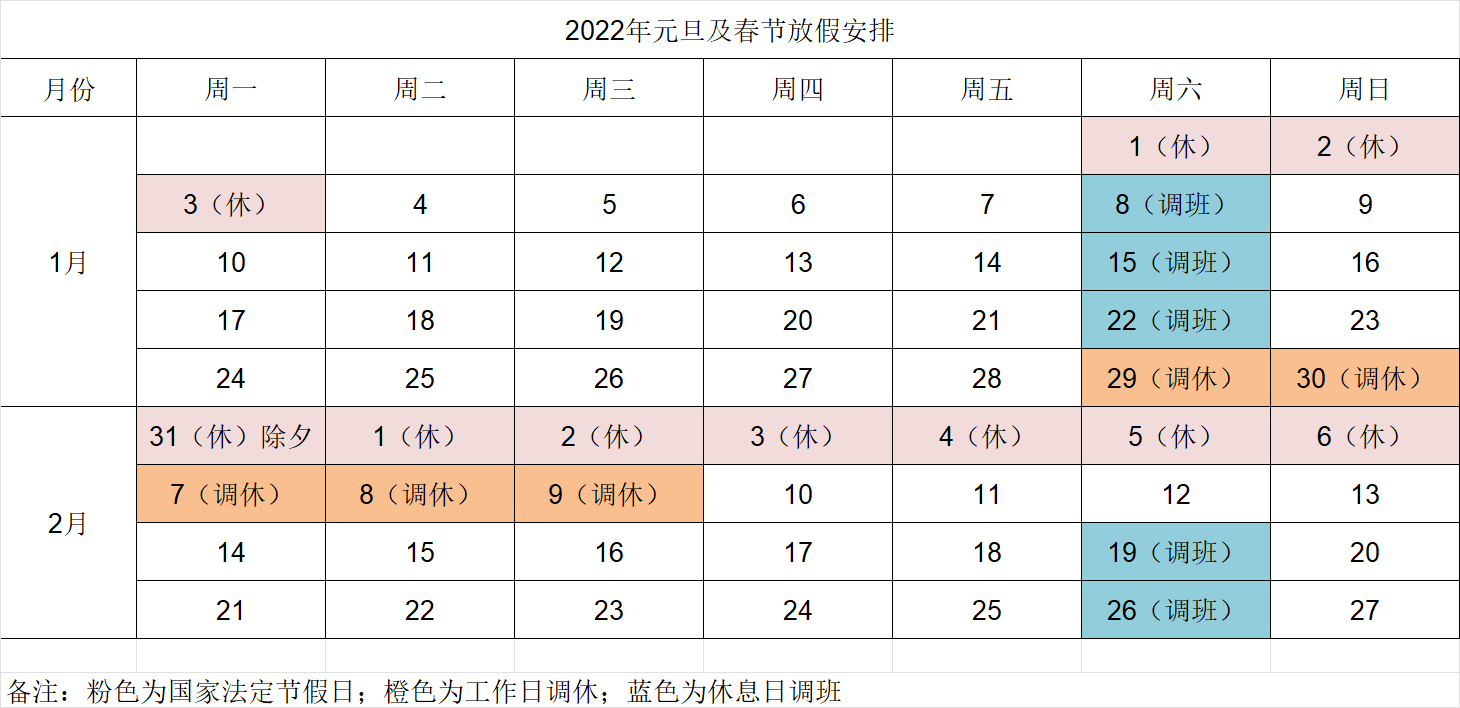 2022年元旦、春節(jié)假期將至,根據(jù)國家節(jié)假日放假規(guī)定,并結(jié)合公司實際情況,經(jīng)研究決定,現(xiàn)將2022年公司休假安排如下: