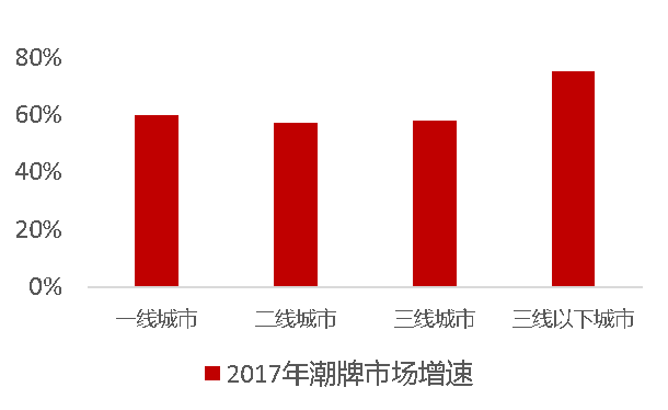 (2)從潮牌服裝市場消費城市規模來看,消費一二線城市引領消費,三線以下城市增速強勁。一二線城市消費基礎好,潮牌消費額處于全國領先的高度,增速相對穩定。而對于三線及以下城市雖然消費額較低,但增幅卻高于一線城市。