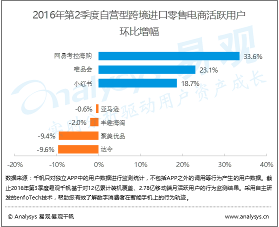 自營(yíng)型跨境進(jìn)口零售電商中,承載其業(yè)務(wù)APP的活躍用戶表現(xiàn)出了較明顯的差距:網(wǎng)易考拉海購(gòu)以33.6%的增長(zhǎng)態(tài)勢(shì)處于第一,其在郵箱、新聞、音樂(lè)、游戲等領(lǐng)域的用戶協(xié)同效應(yīng)逐漸被釋放出來(lái)。唯品會(huì)與小紅書(shū)差距不大,分列以23.1%和18.7%居于第二、第三位,其余的主要廠商,第2季度的活躍用戶環(huán)比都為負(fù)增長(zhǎng)。
