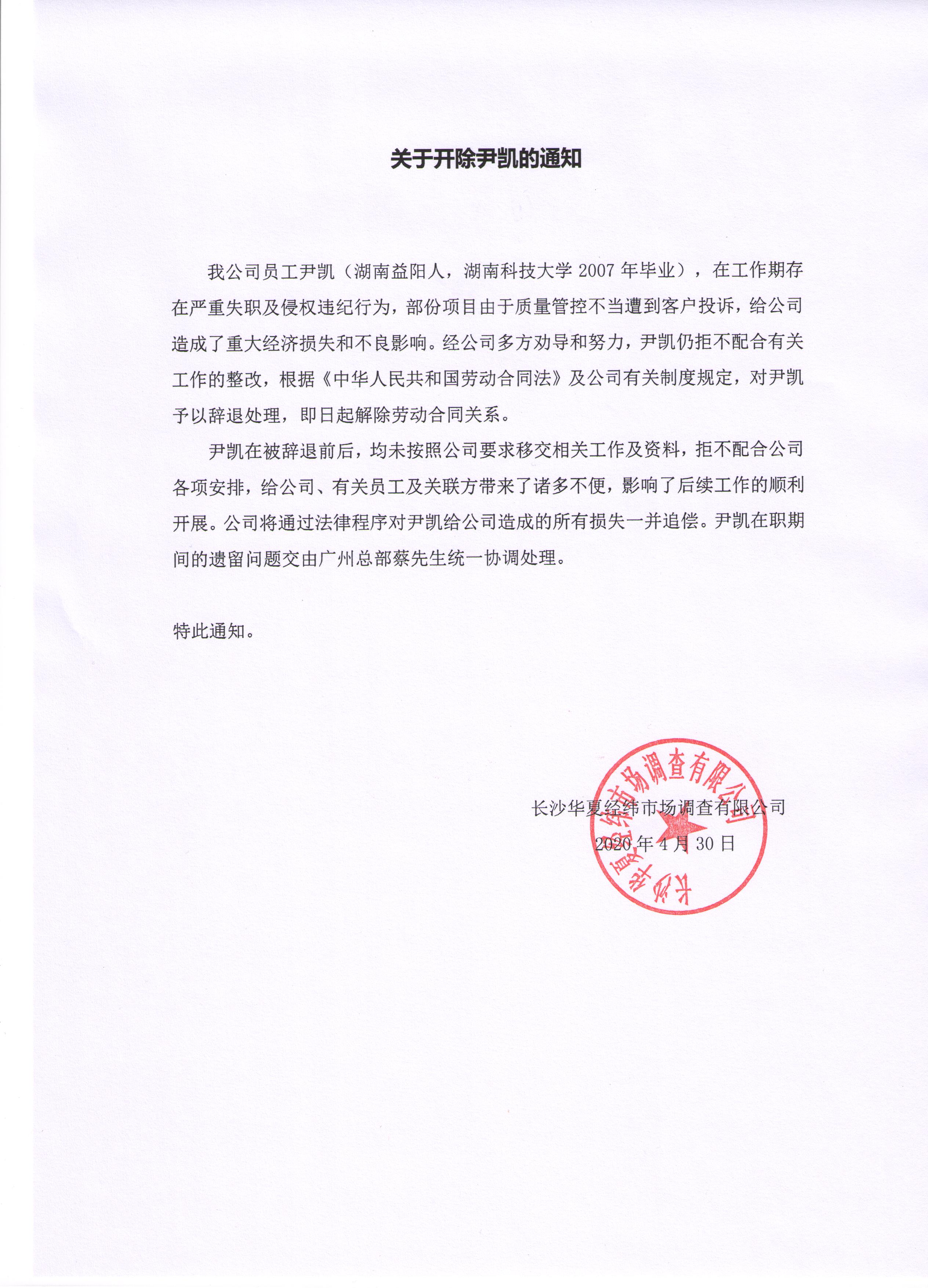關于開除尹凱的通知