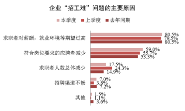 從招工難的原因看,一是求職者對(duì)薪酬、就業(yè)環(huán)境期望過(guò)高,占80.5%,環(huán)比增加了1.0個(gè)百分點(diǎn)。二是符合崗位要求的應(yīng)聘者減少,即人崗不適應(yīng)的,占59.0%,三是求職者人數(shù)總體減少,占17.5%。從三個(gè)季度的監(jiān)測(cè)情況看,人崗不適應(yīng)的情況略有增多。(此項(xiàng)為多選,各項(xiàng)占比相加不等于100%)