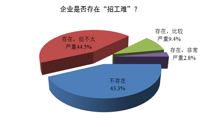 調(diào)查顯示,一季度的353家企業(yè)中有200家企業(yè)認(rèn)為目前存在“招工難”問(wèn)題,占比達(dá)56.7%,環(huán)比上升4.3個(gè)百分點(diǎn),其中認(rèn)為目前存在“招工難”問(wèn)題但不太嚴(yán)重的有157家,占44.5 %,認(rèn)為比較嚴(yán)重的有33家,占9.4%,非常嚴(yán)重的有10家,占2.8 %。